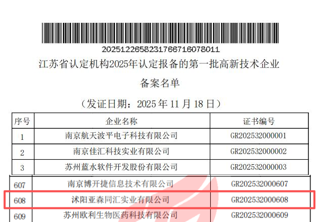 近日,江蘇省認(rèn)定機(jī)構(gòu)2025年認(rèn)定報(bào)備的第一批高新技術(shù)企業(yè)備案名單出爐,蘇豪亞森參股企業(yè)沭陽(yáng)亞森同匯憑借扎實(shí)的研發(fā)實(shí)力、突出的創(chuàng)新成果及規(guī)范的管理體系,成功通過認(rèn)定,正式躋身國(guó)家高新技術(shù)企業(yè)行列,標(biāo)志著亞森同匯在技術(shù)研發(fā)創(chuàng)新、科技成果轉(zhuǎn)化及企業(yè)可持續(xù)發(fā)展等方面的綜合實(shí)力,獲得了高度認(rèn)可和權(quán)威肯定。